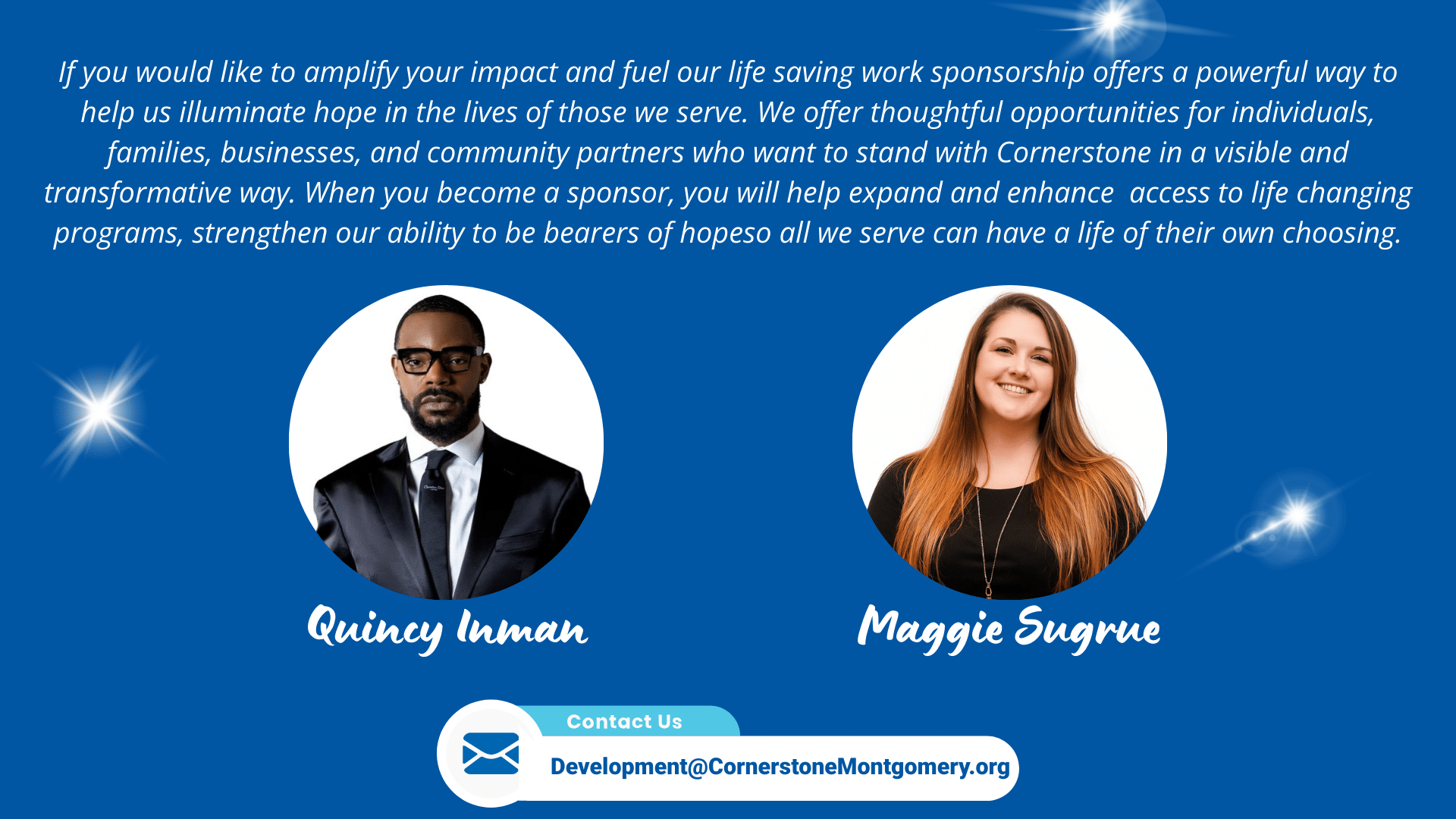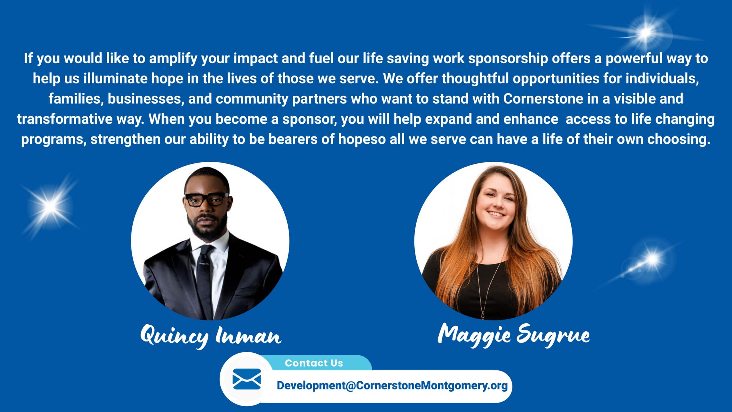 Sponsor a Ticket – $80 Sponsor a ticket for a Cornerstone client or staff member to attend this evening of celebration and transformation. Your gift ensures that those who make and experience our mission every day can join in the joy.